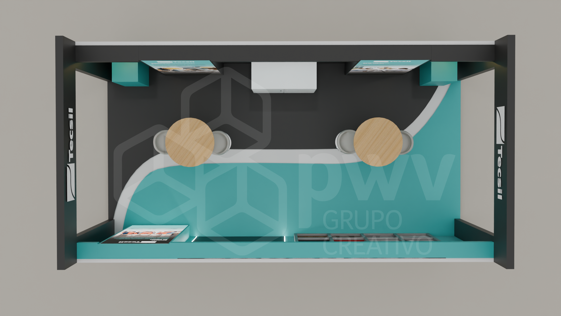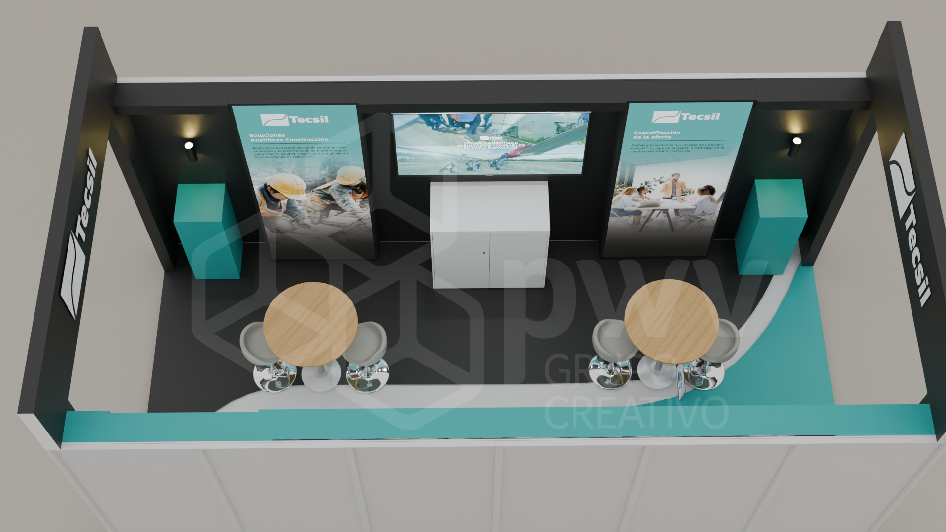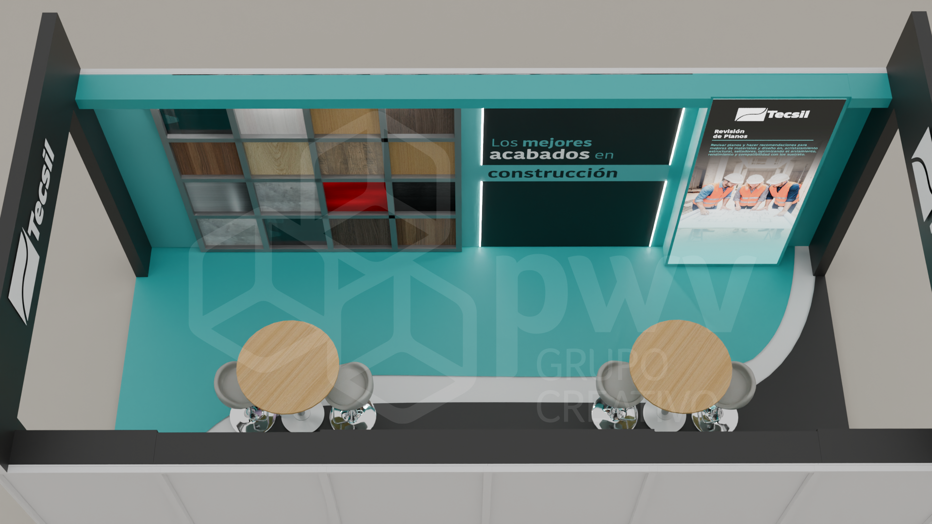 Los dibujos en 3D son aproximaciones y pueden presentar variaciones en los acabados, texturas y materiales que podrían cambiar según los ajustes que se hagan a los presupuestos. El mobiliario se produce tras el pago del anticipo de la factura y está sujeto a disponibilidad. Cualquier material, pantalla o elemento que se instale y sea propiedad del cliente, será exclusivamente su responsabilidad. Este diseño es propiedad intelectual de PWV Grupo Creativo S.AS.