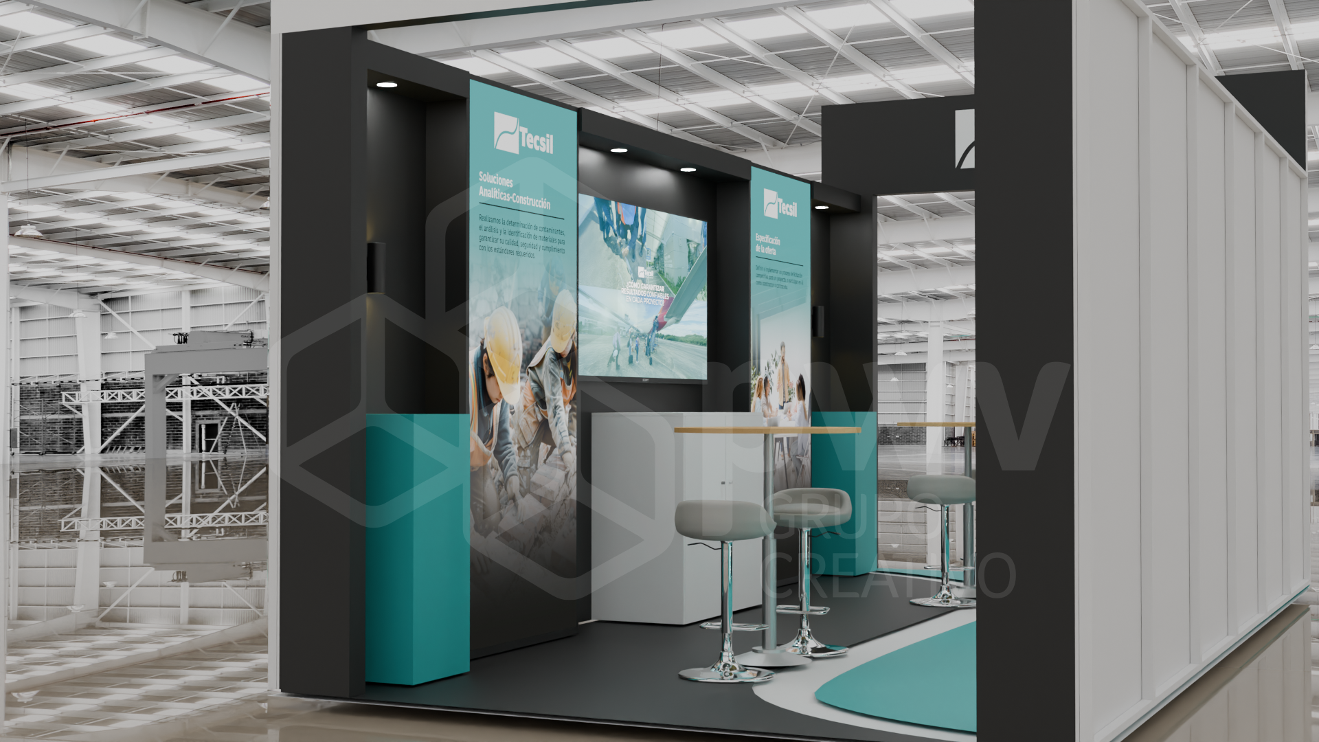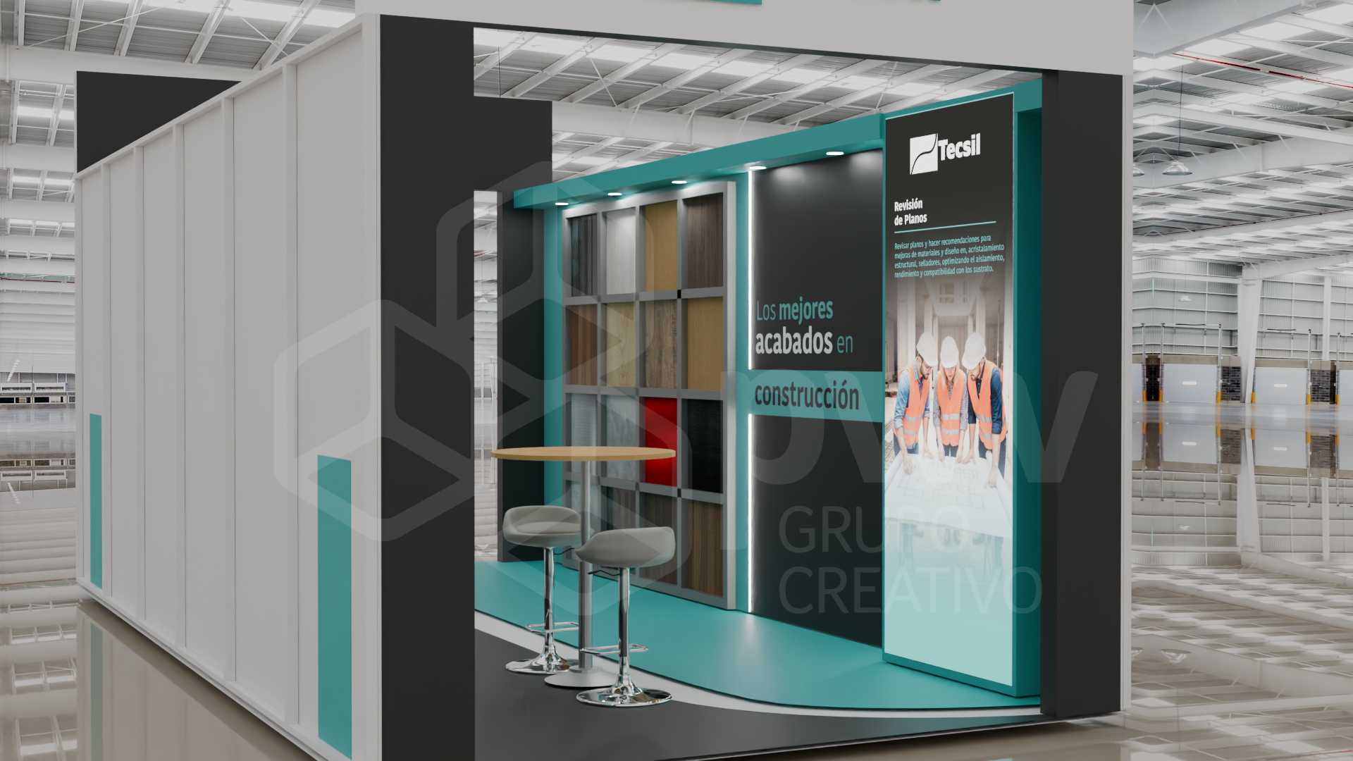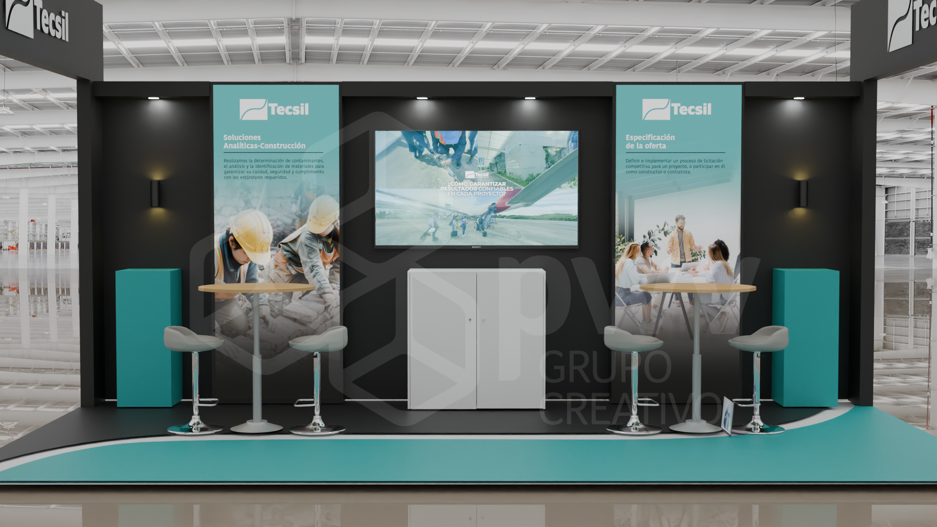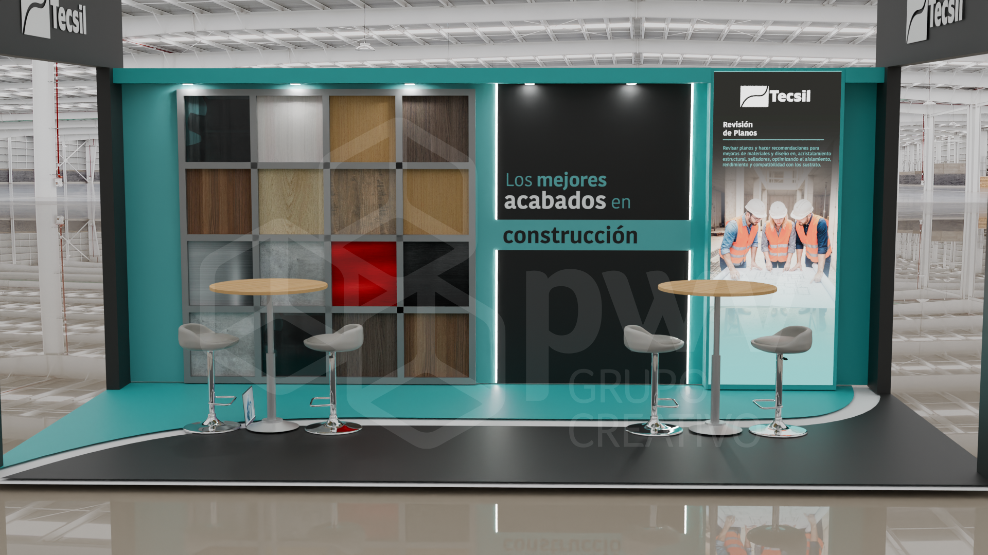 Los dibujos en 3D son aproximaciones y pueden presentar variaciones en los acabados, texturas y materiales que podrían cambiar según los ajustes que se hagan a los presupuestos. El mobiliario se produce tras el pago del anticipo de la factura y está sujeto a disponibilidad. Cualquier material, pantalla o elemento que se instale y sea propiedad del cliente, será exclusivamente su responsabilidad. Este diseño es propiedad intelectual de PWV Grupo Creativo S.AS.